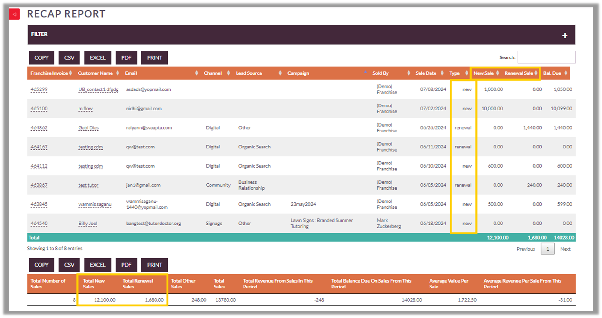 The Recap Report shows all sales within a specified time period based on the date filter you set. Use this report to differentiate between new sales and renewals, analyze new sales by lead source, identify which lead sources are driving the most sales and understand how this impacts your marketing strategy, to determine your F4 and average renewal values and explore any opportunities to leverage these numbers for business planning.