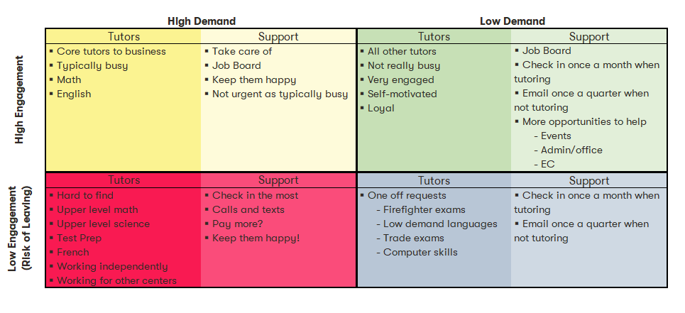 The tutors in the bottom left quadrant (red) are those tutors who have low engagement and are in high demand. These tutors are core to your business, typically tutoring upper level math and science, test prep in the US, French in Canada, and any other subject you find is in high demand, but hard to recruit tutors for. These group also includes any in demand tutors that are also tutoring independently or for other tutoring companies, as they have alternative tutoring income that they can increase should they chose to leave Tutor Doctor. Think of this group as your A priority tutors. These tutors will have the greatest impact on your business if they choose to leave and will be the hardest to replace. It is very important to maintain and increase their engagement as much as possible and to ensure that they are supported and feel their expectations of working with Tutor Doctor are being met, as this group creates the most significant negative impact for you should they choose to leave.